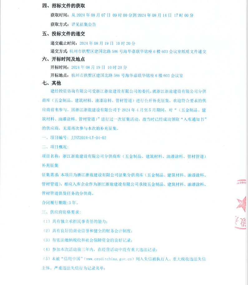 浙江浙旅建設(shè)有限公司分供商庫(五金制品、建筑材料、油漆涂料、管材管道)補(bǔ)充征集公告